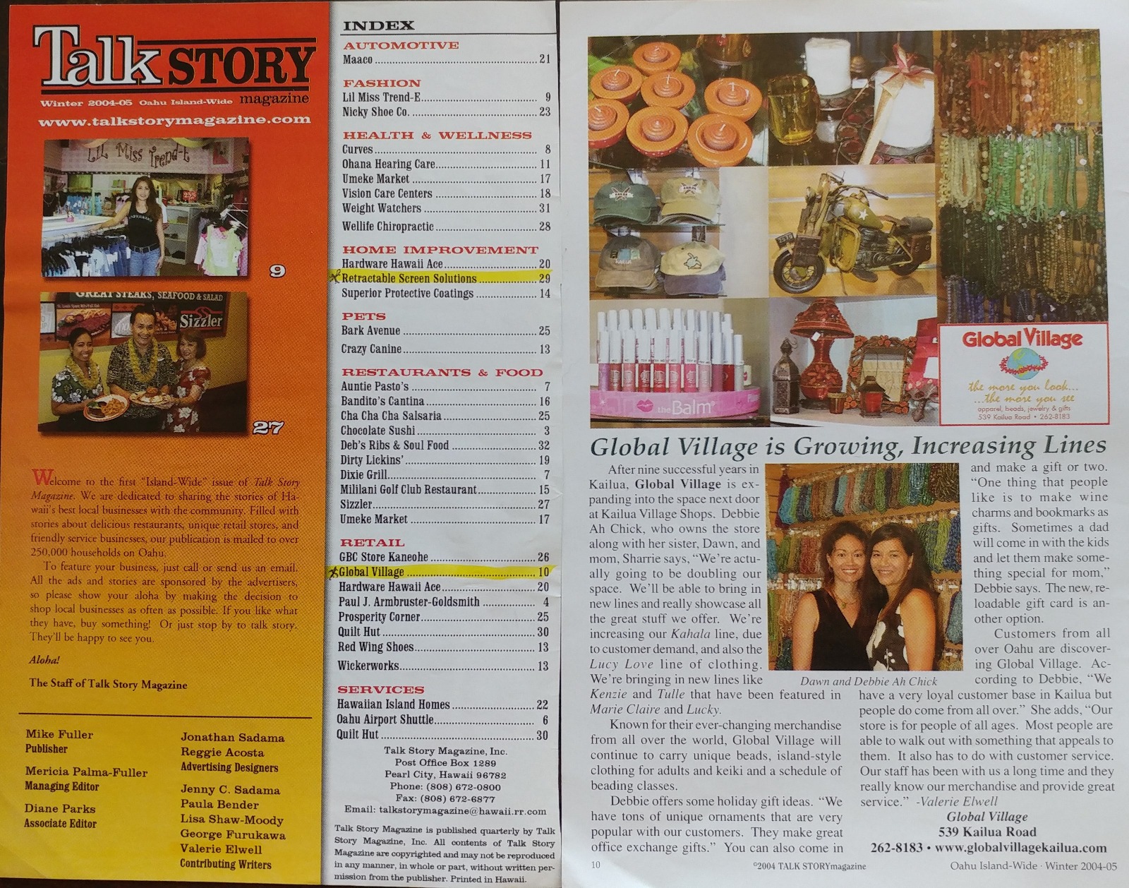 Talk Story Magazine • 17th April 2018 Global Village After nine successful years in Kailua, Global Village is expanding into the space next door at Kailua Village Shops.